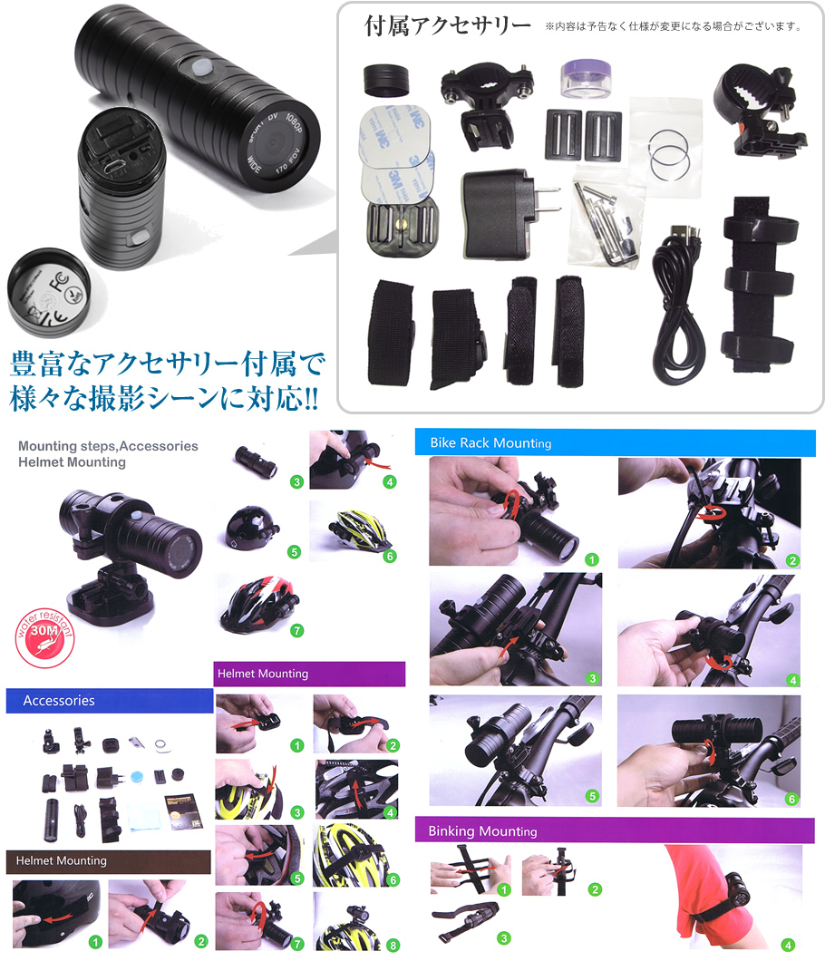 防水ケース・充電器・USBケーブル・レンズ吹き・ネジ類・両面テープ・バンド・固定用バックル・ハンドル用ステー・ヘルメット用スタンド